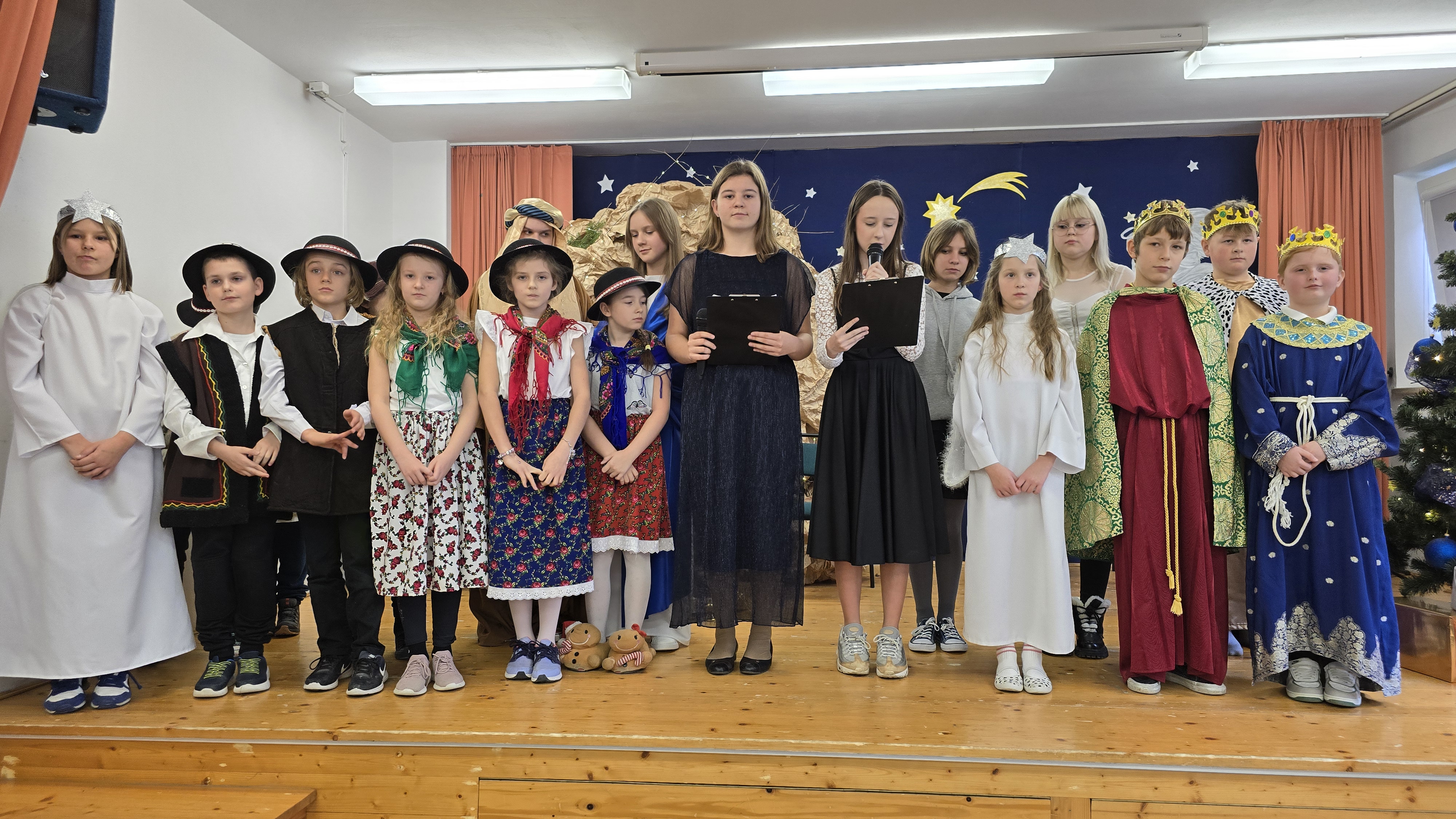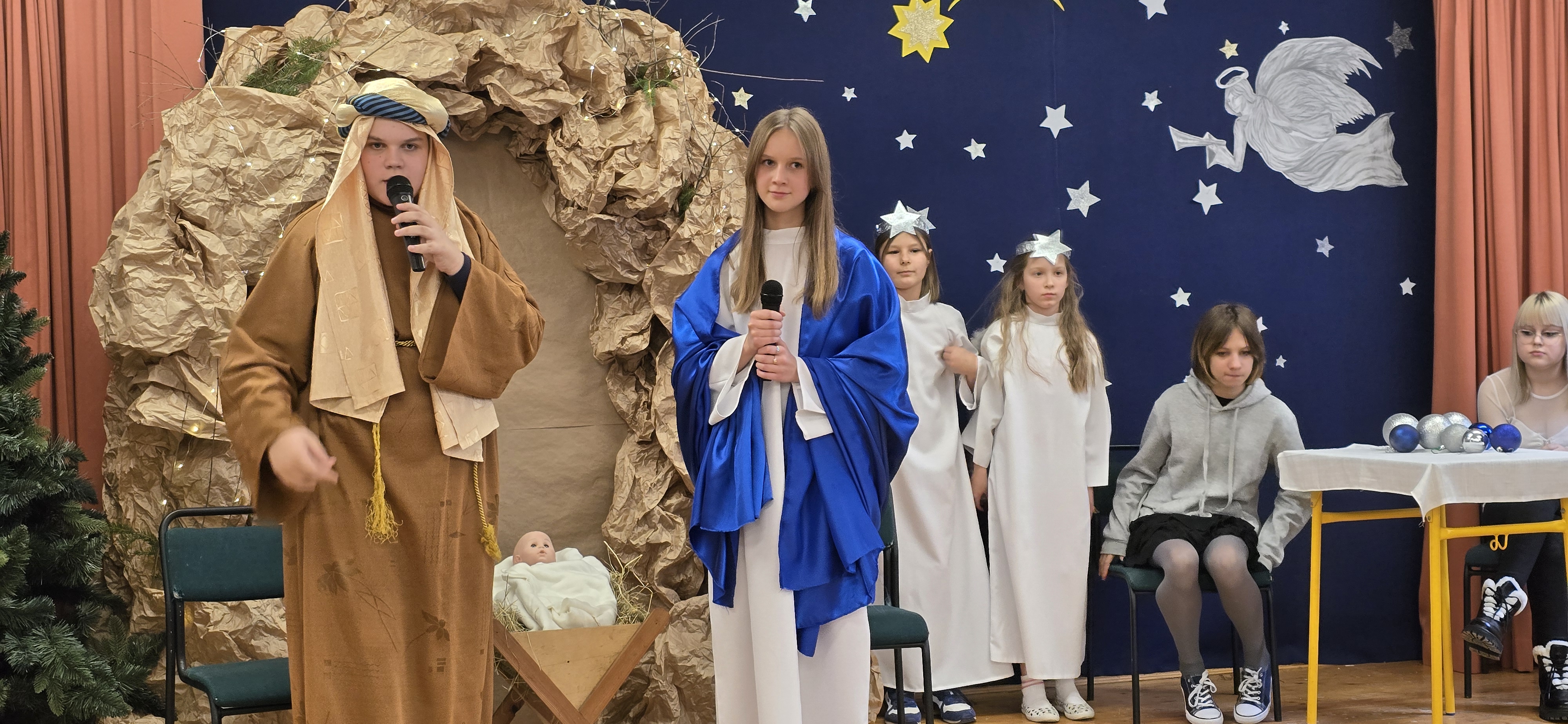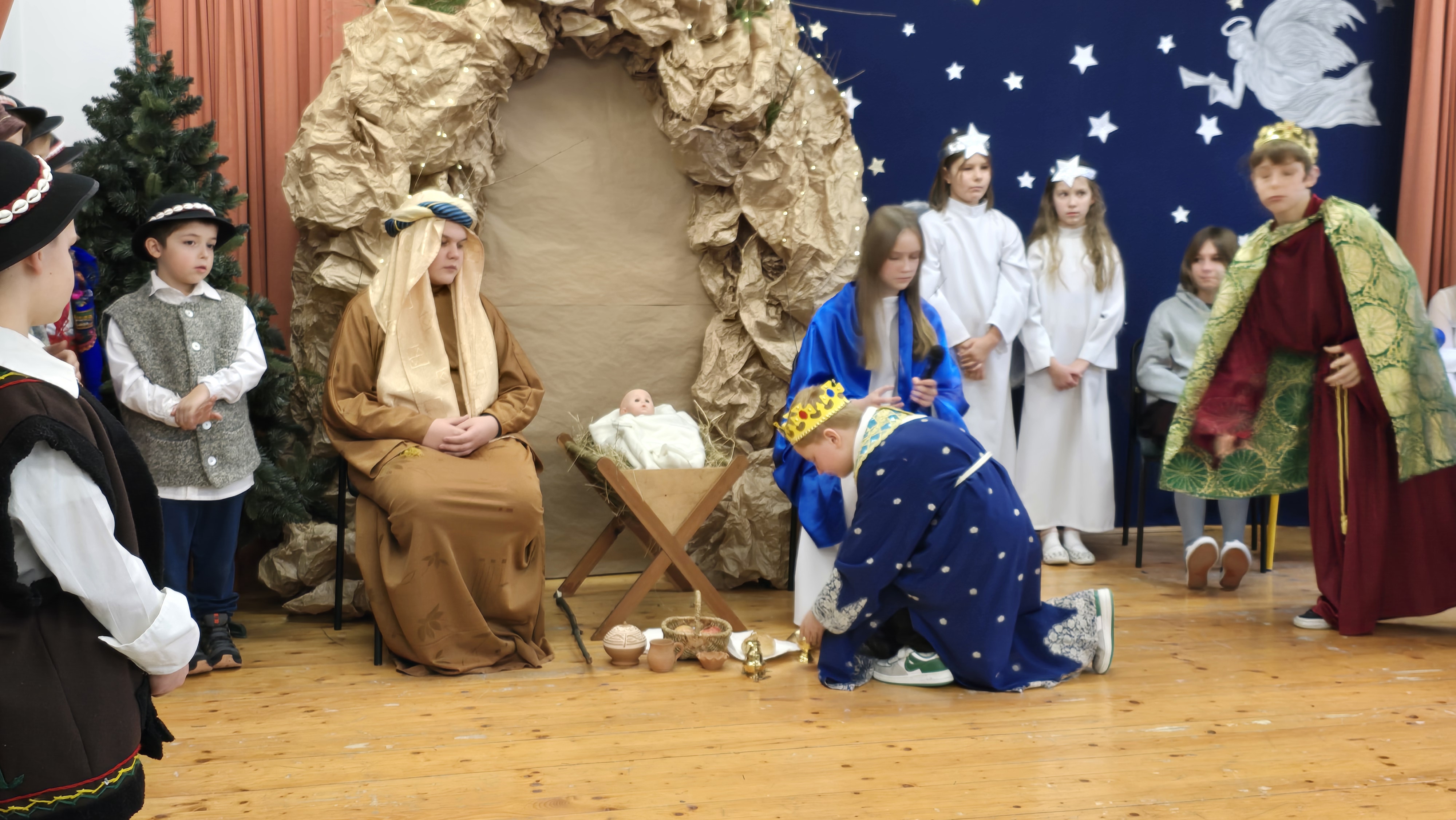 Jasełka były opowieścią snutą przez mamę do córki w czasie przygotowań do świąt, przywołując historię narodzin Jezusa w Betlejem, począwszy od drogi Maryi i Józefa do stajenki, aż po przybycie pasterzy i Trzech Króli. W spektaklu wzięły również udział postacie biblijne, takie jak anioły, pasterze i królowie. Uczniowie wystąpili w pięknych strojach, a przedstawienie wzbogacono o wzruszającą muzykę i świąteczne kolędy, które wprowadziły wszystkich w bożonarodzeniowy nastrój.
