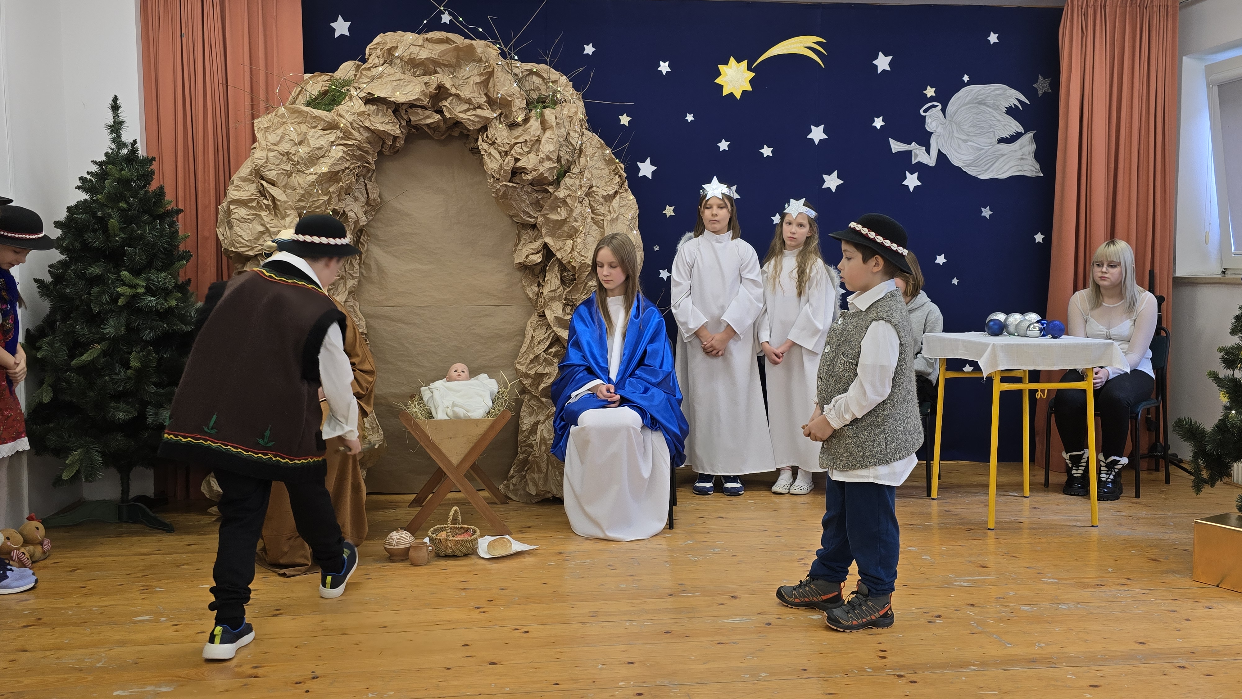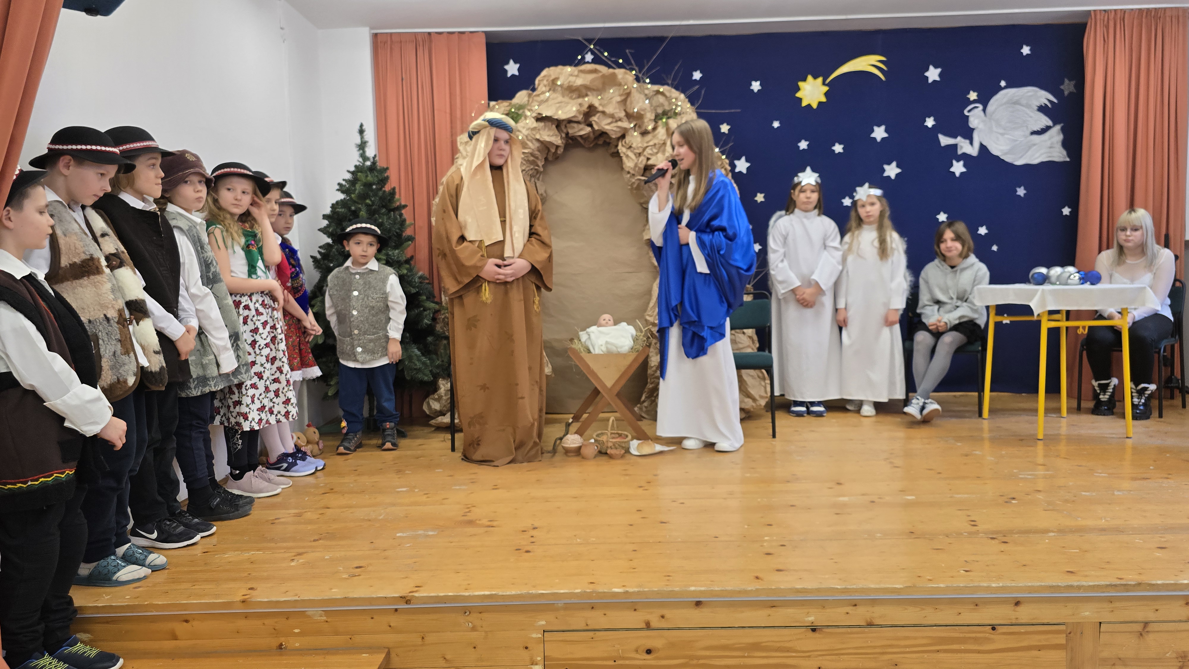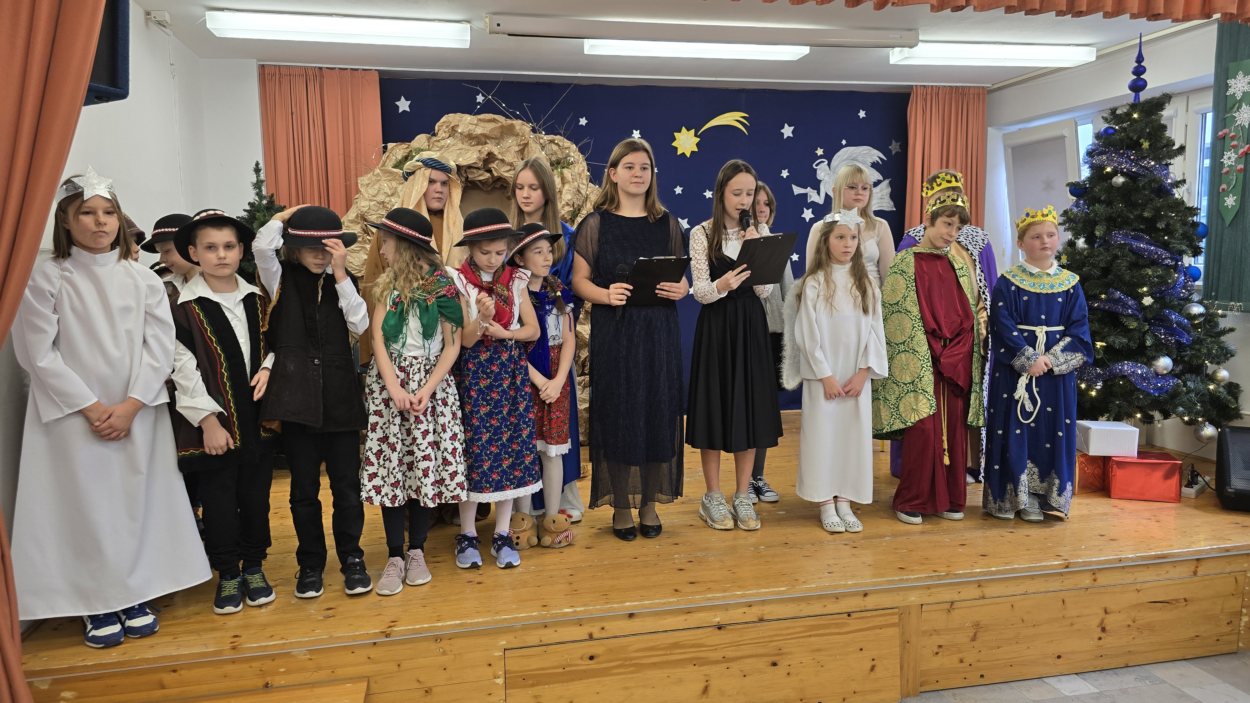 Jasełka były opowieścią snutą przez mamę do córki w czasie przygotowań do świąt, przywołując historię narodzin Jezusa w Betlejem, począwszy od drogi Maryi i Józefa do stajenki, aż po przybycie pasterzy i Trzech Króli. W spektaklu wzięły również udział postacie biblijne, takie jak anioły, pasterze i królowie. Uczniowie wystąpili w pięknych strojach, a przedstawienie wzbogacono o wzruszającą muzykę i świąteczne kolędy, które wprowadziły wszystkich w bożonarodzeniowy nastrój.