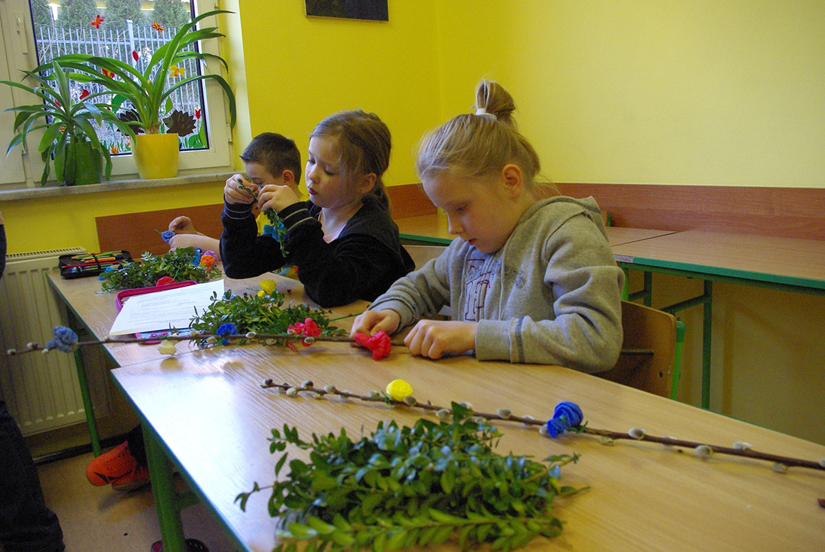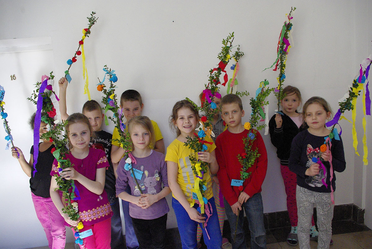 Przygotowując się do pełnego uczestnictwa w przeżyciu Triduum Paschalnego uczniowie młodszych klas szkoły podstawowej na lekcjach religii wykonali z gałązek wierzbowych, bukszpanu i kwiatów z kolorowej bibuły, każdy dla siebie, piękne palmy. Przez wykonanie palm zgodnie z tradycją podhalańską uczniowie przygotowali się do udziału w procesji Niedzieli Męki Pańskiej.