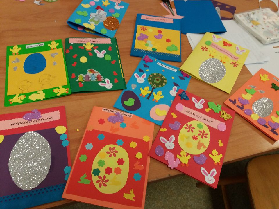 Okres świąt to czas , kiedy wysyłamy kartki świąteczne i składamy naszym najbliższym życzenia. P. Ewa, p. Renata 18. 04.2019 r. i p. Beata 20.04.- pokazały nam jak można wykonać kartki wielkanocne różnymi technikami. Każdy z nas mógł wykazać się pomysłowością i kreatywnością. Powstały śliczne, różnorodne prace, które zawierały także samodzielnie zredagowane przez nas życzenia dla naszych rodziców.