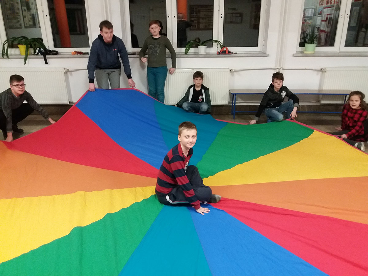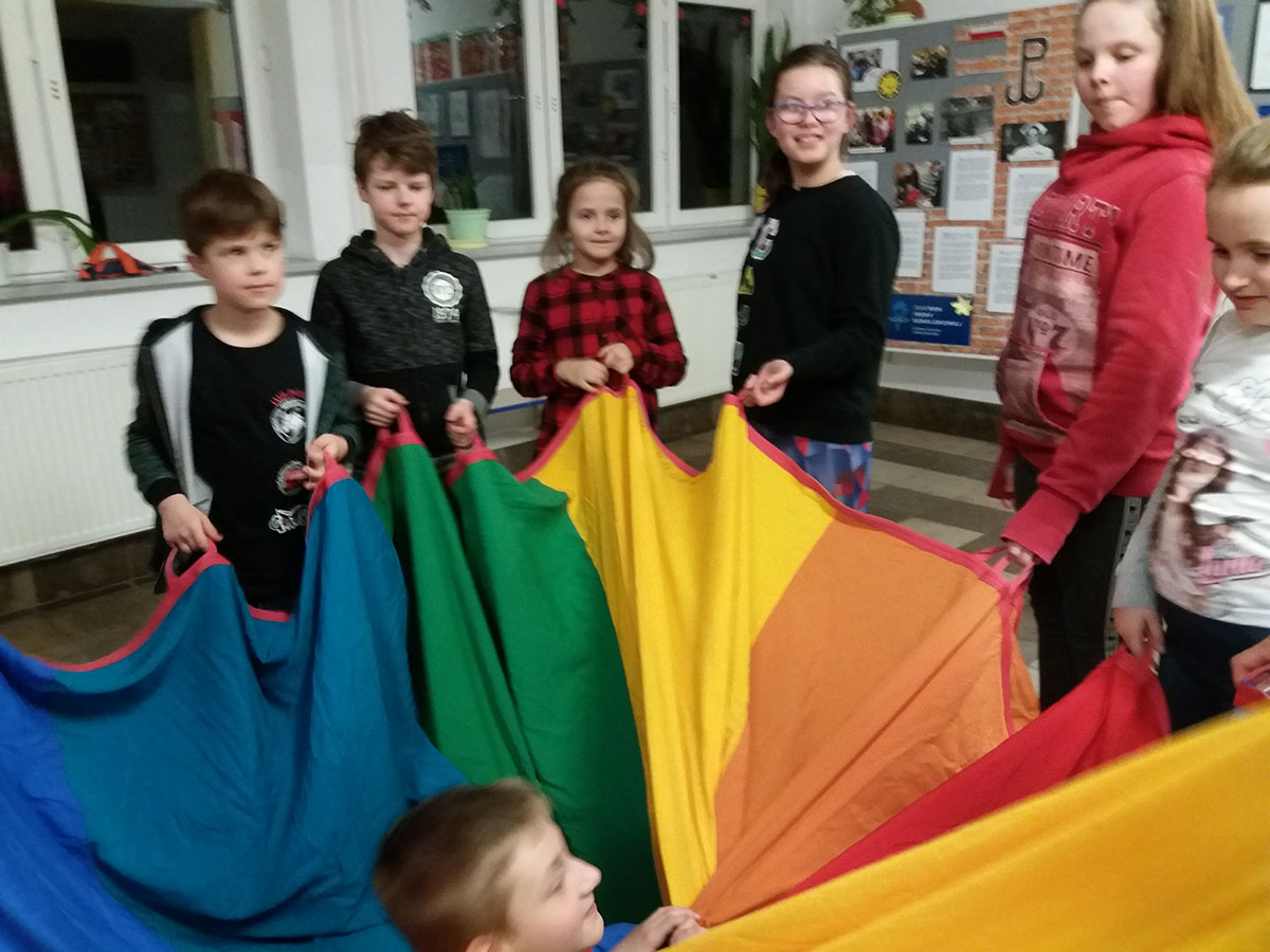 15. 03. 2019r. pod kierunkiem p. Beaty bawiliśmy się kolorową chustą. Zabawy wprowadziły radosny nastrój odprężenia po zajęciach szkolnych. Z radością mogliśmy ją podrzucać, turlać się po niej, chować się pod nią , tańczyć z nią, a także zawijać kolegów i koleżanki. Zabawy wymagały od nas skupienia uwagi, oraz koncentracji, pobudzały naszą wyobraźnię, rozwijały kreatywność oraz poczucie rytmu. Była to dla nas ogromna porcja ruchu i dobrej zabawy.