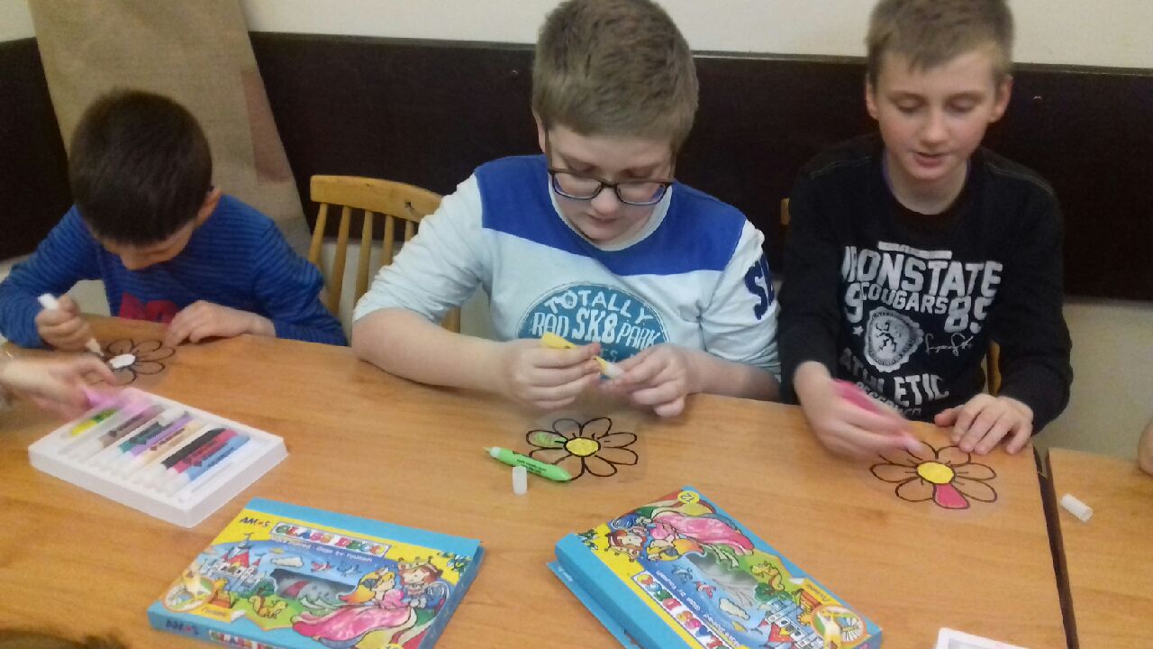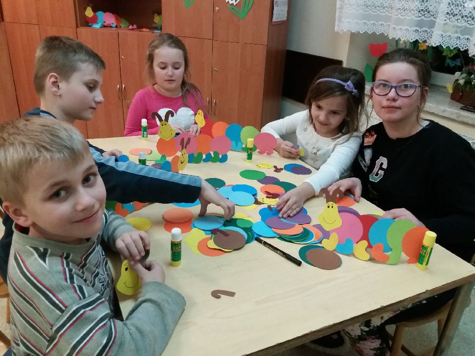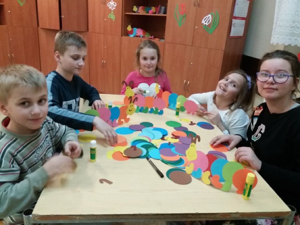 18.03. 2019r. po kolacji n, p. Halinka zaprosiła nas na warsztaty artystyczne z wykorzystaniem kolorowych kółek. Wykonując kolejne etapy udało nam się wykonać kolorowe stonogi. Śmiech i dobra zabawa towarzyszyły nam przez cały czas zajęć.