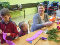 15.03. 2016 r. odbyły się otwarte zajęcia plastyczne pt.: ''Kwiaty do palmy wielkanocnej". W zajęciach uczestniczyły dzieci przebywające na leczeniu z rodzicami. Uczestnicy zapoznali się ze sposobami wykonania różnych wzorów kwiatów z krepiny oraz "splotu cukierkowego".