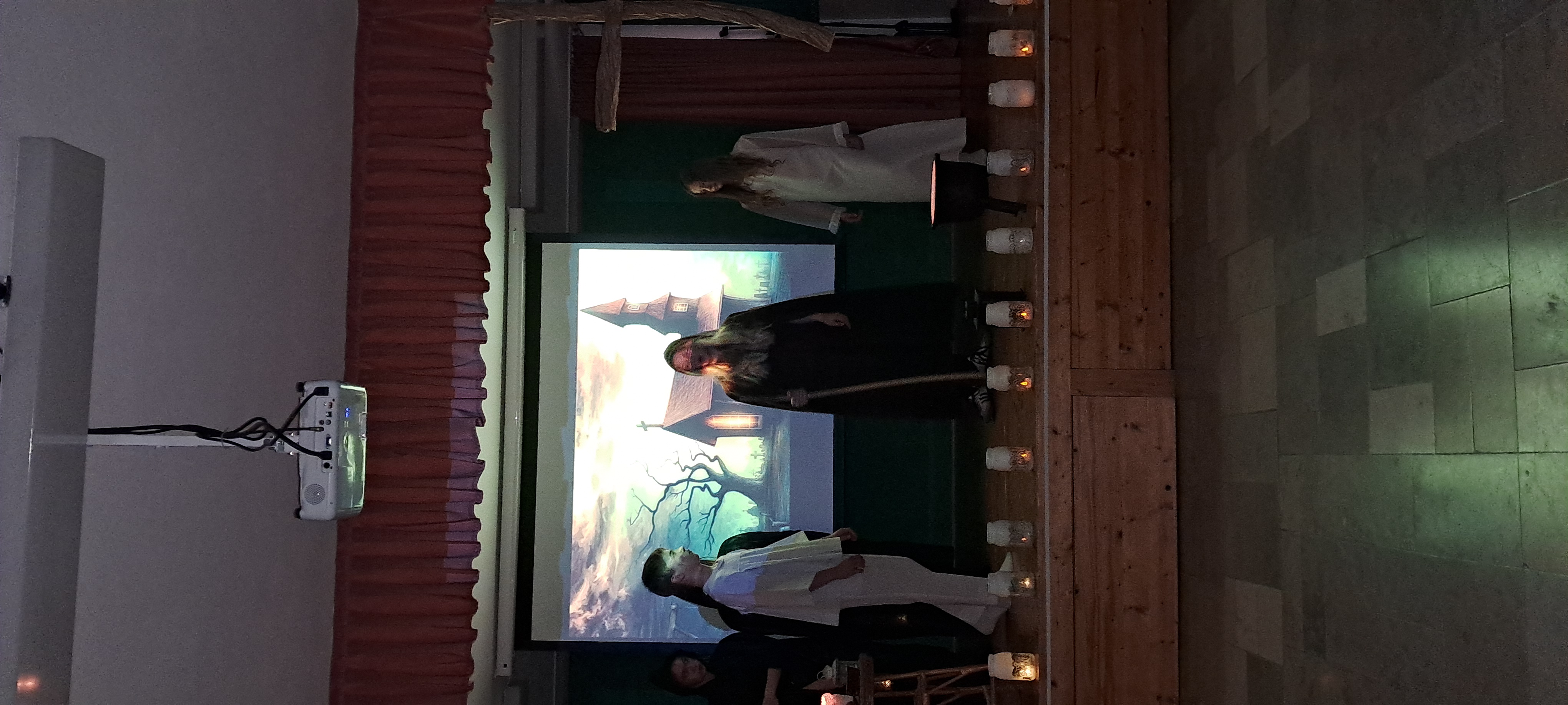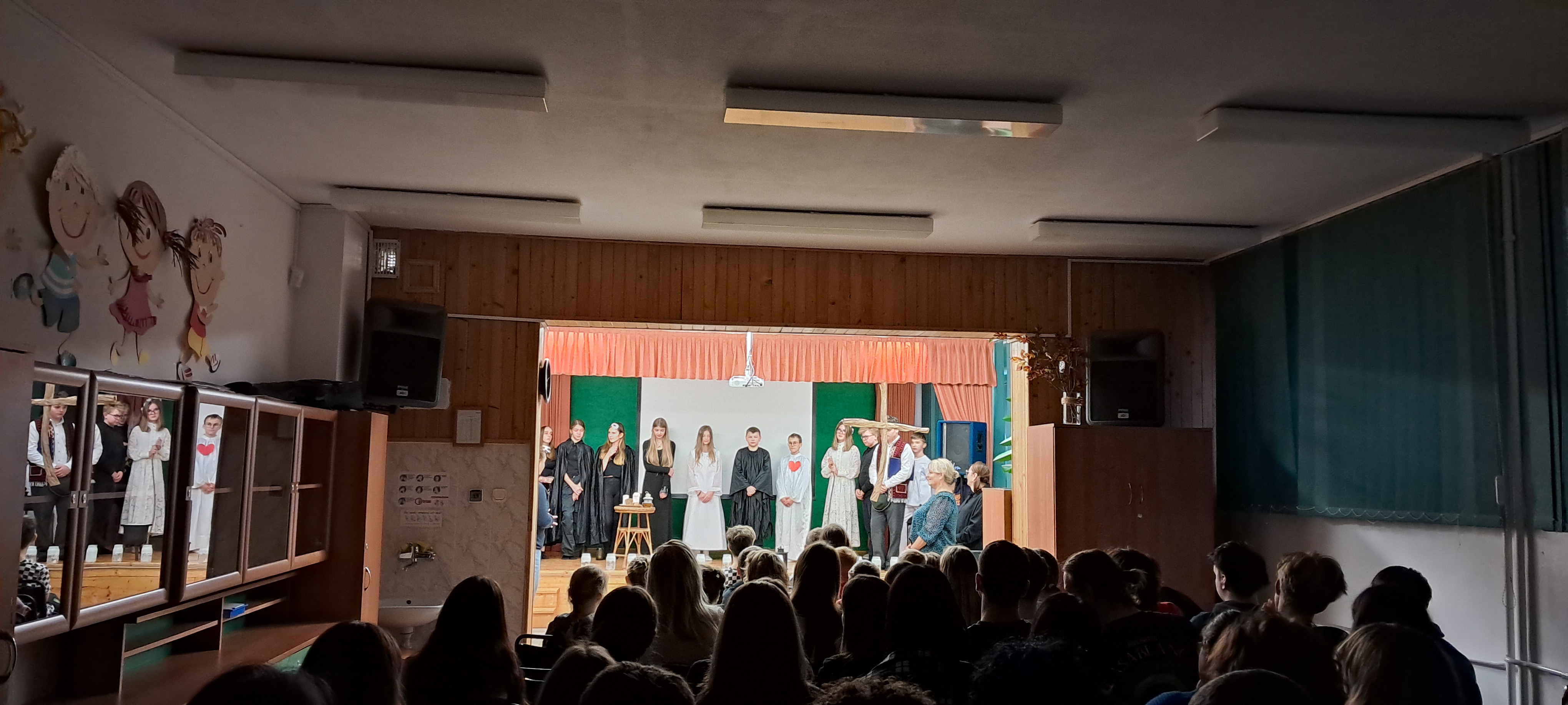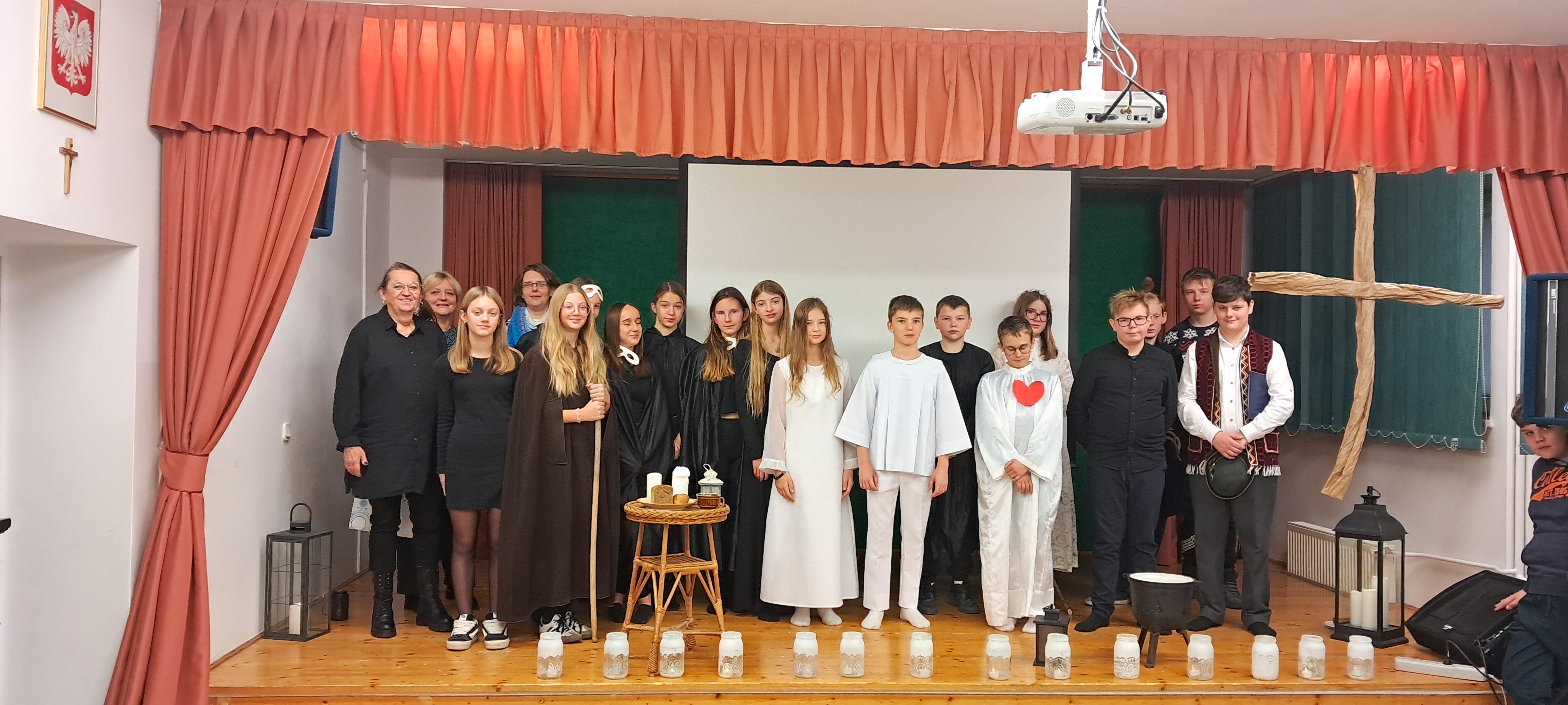 4 grudnia gościliśmy grupę teatralną z Katolickiej Szkoły Podstawowej w Rabce-Zdroju. Młodzi aktorzy wystąpili z inscenizacją fragmentów II części „Dziadów” oraz ballady „Romantyczność” Adama Mickiewicza. Przedstawienie wprowadziło nas w tajemniczy świat romantyków. Z zapartym tchem śledziliśmy ludowy obrzęd wywoływania duchów, który nasi przodkowie odprawiali 1 listopada. Przewodniczący obrzędom Guślarz wzywał pokutujące dusze, aby im pomóc w dostaniu się do nieba. W zamian za pomoc dusze udzielały ludziom porad i wskazówek, jak mają żyć, aby po śmierci osiągnąć szczęście wieczne. Na uznanie zasługuje ciekawy pomysł realizacji, scenografia, muzyka, a przede wszystkim wspaniała gra młodych aktorów. Dziękujemy uczniom z zaprzyjaźnionej szkoły za piękny występ i moc pozytywnych wrażeń.