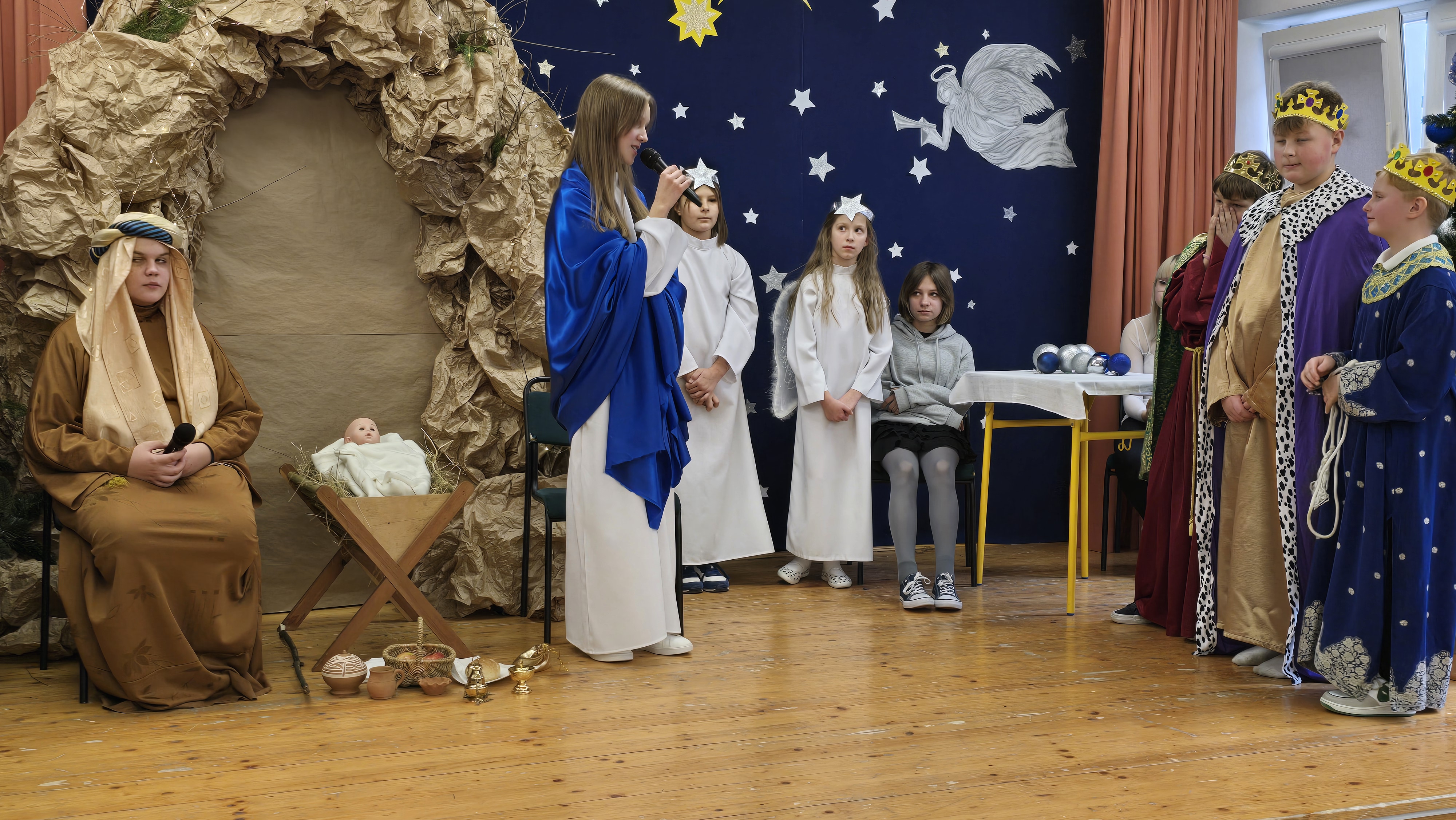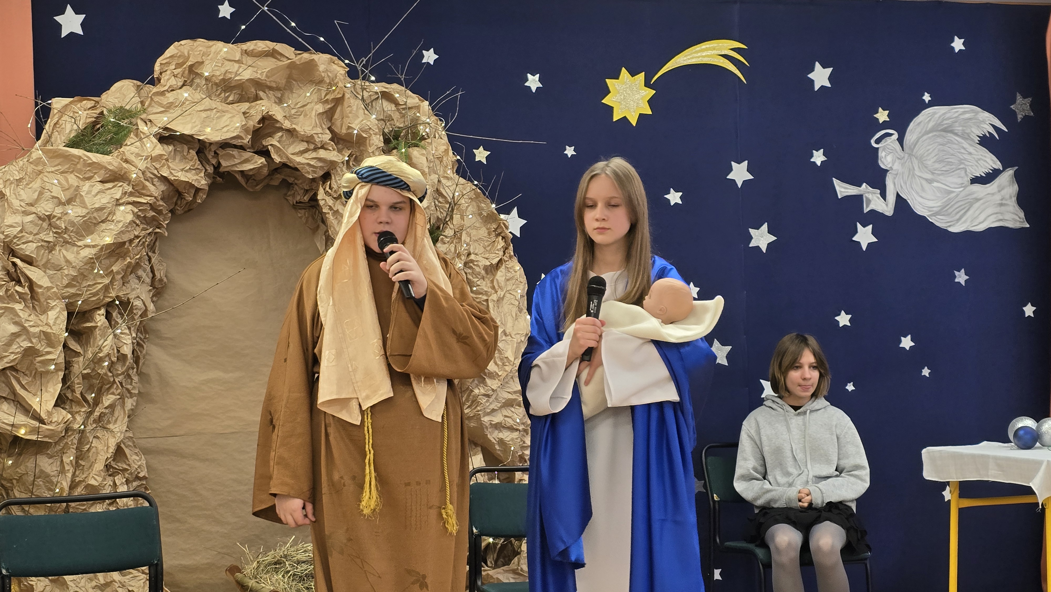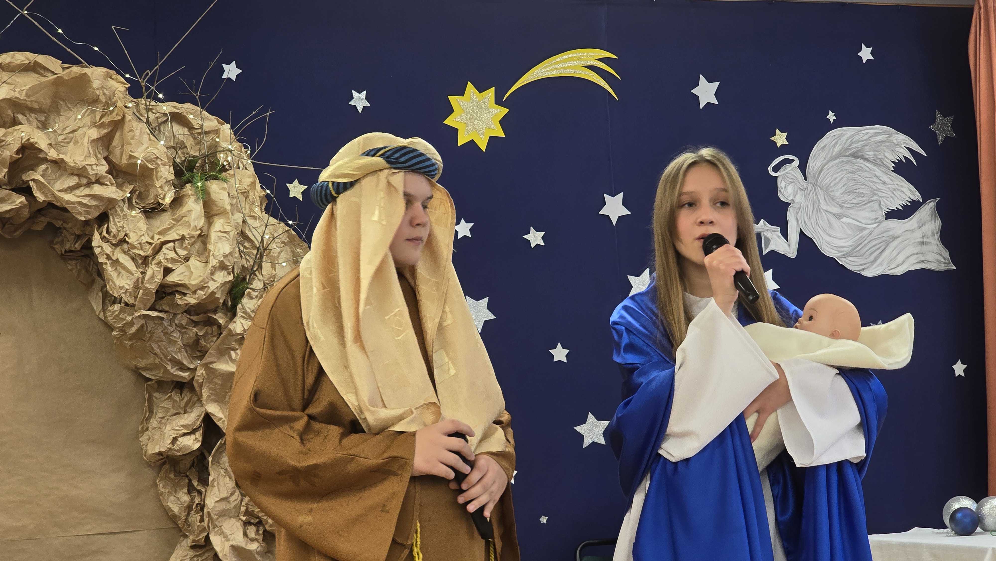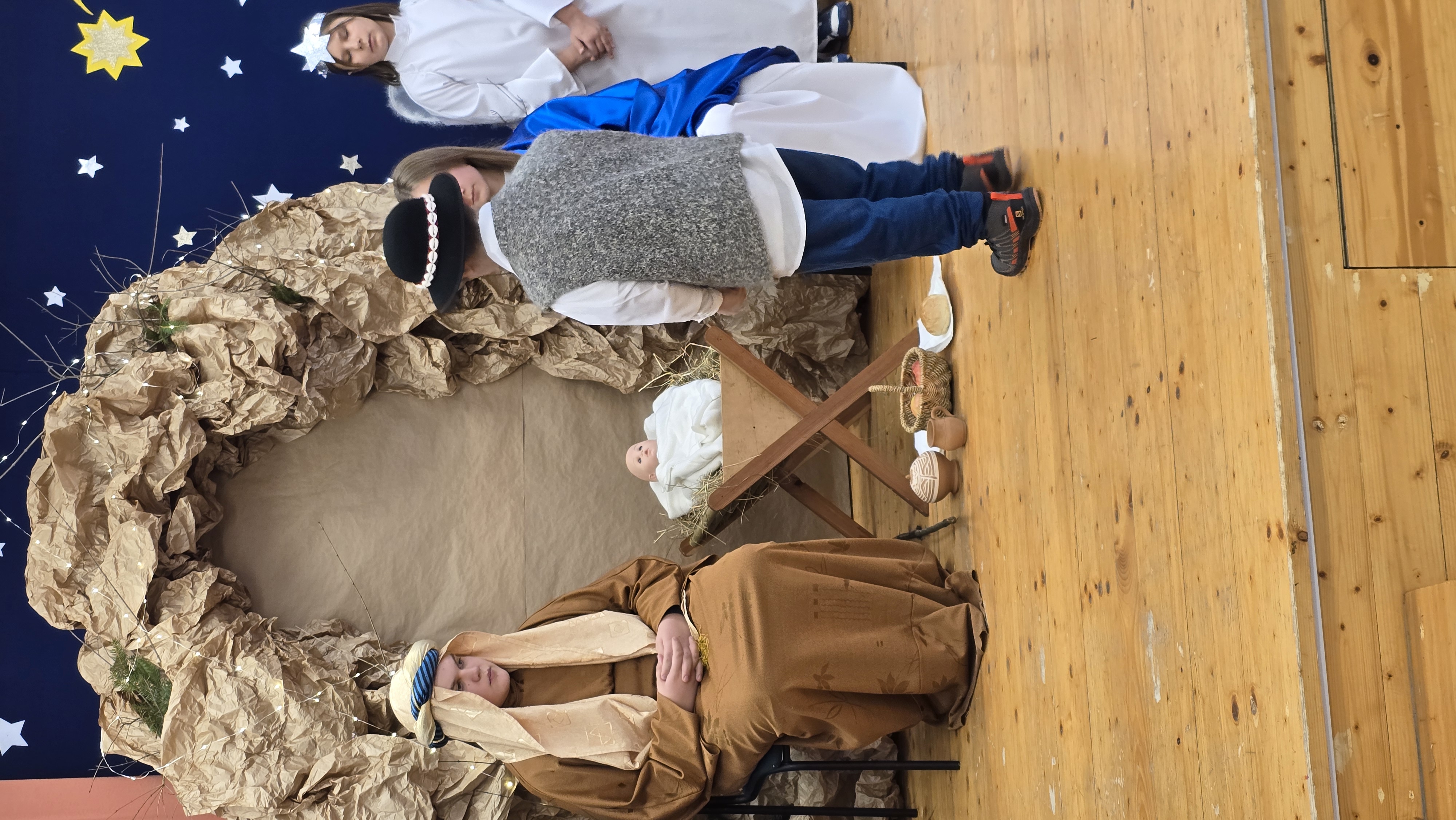 Jasełka były opowieścią snutą przez mamę do córki w czasie przygotowań do świąt, przywołując historię narodzin Jezusa w Betlejem, począwszy od drogi Maryi i Józefa do stajenki, aż po przybycie pasterzy i Trzech Króli. W spektaklu wzięły również udział postacie biblijne, takie jak anioły, pasterze i królowie. Uczniowie wystąpili w pięknych strojach, a przedstawienie wzbogacono o wzruszającą muzykę i świąteczne kolędy, które wprowadziły wszystkich w bożonarodzeniowy nastrój.
