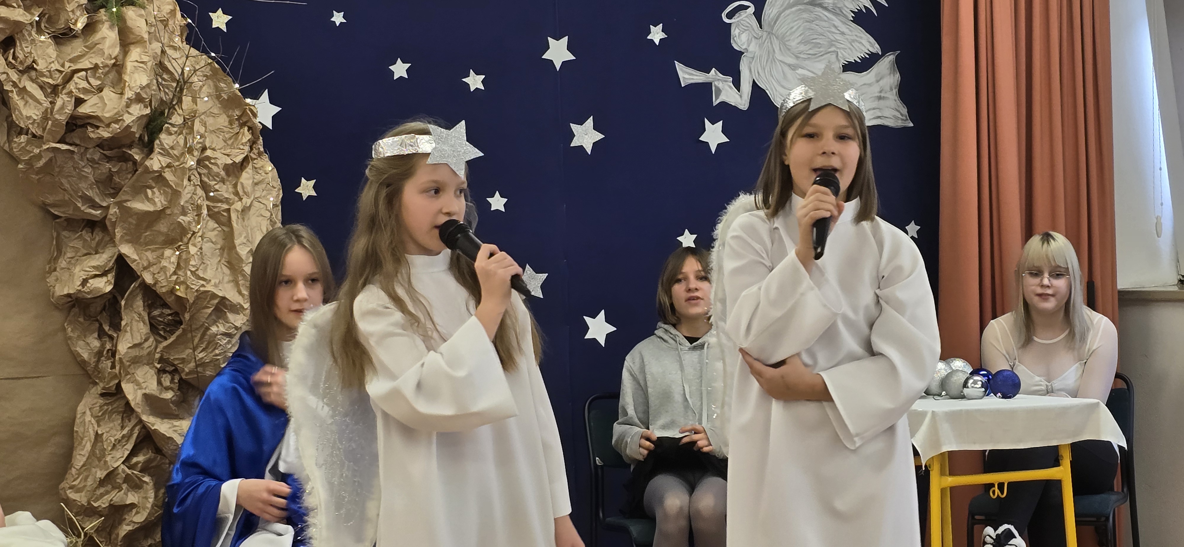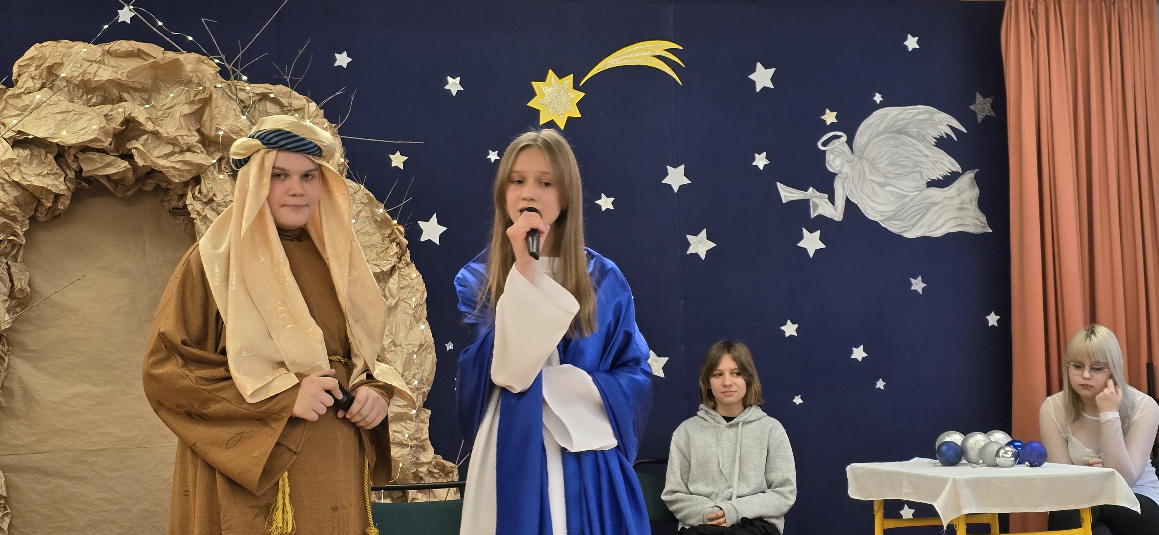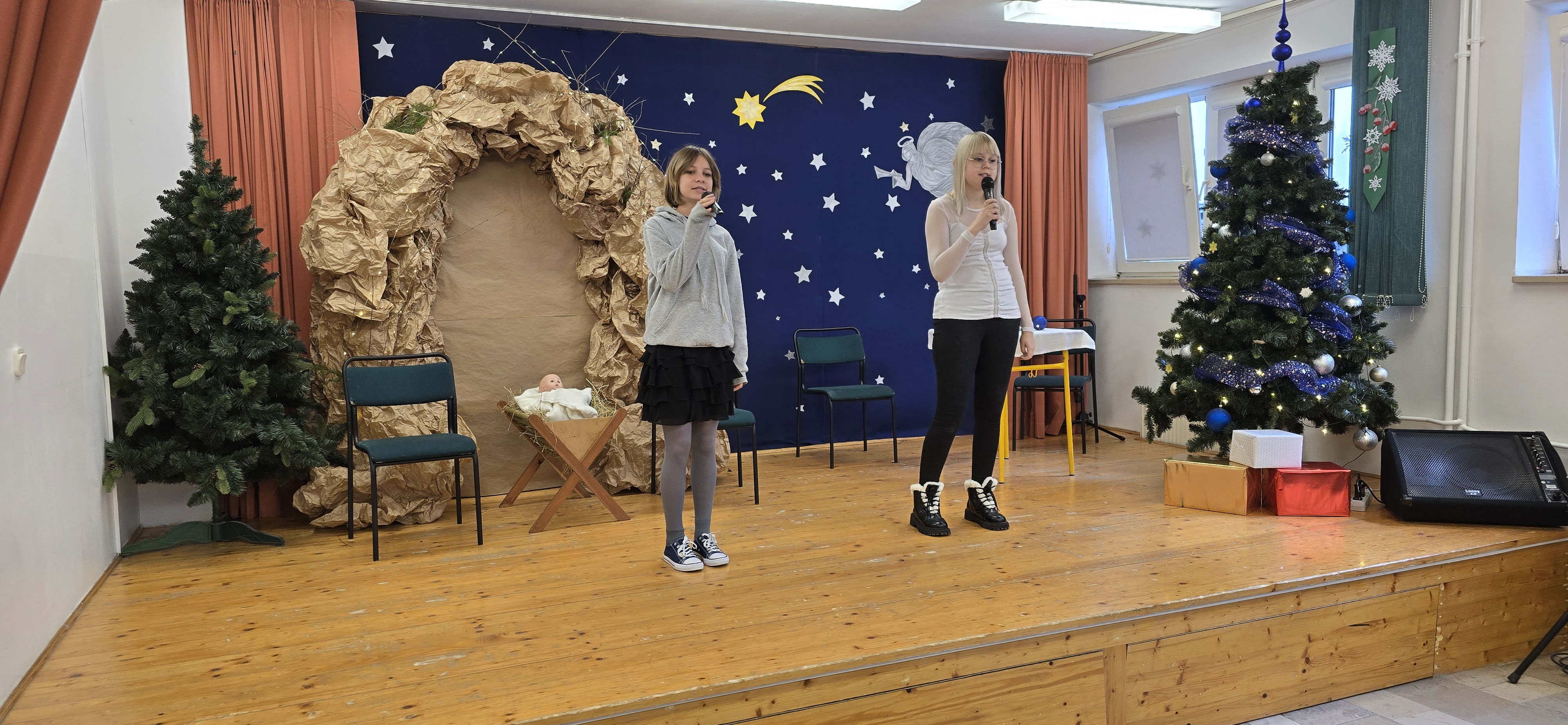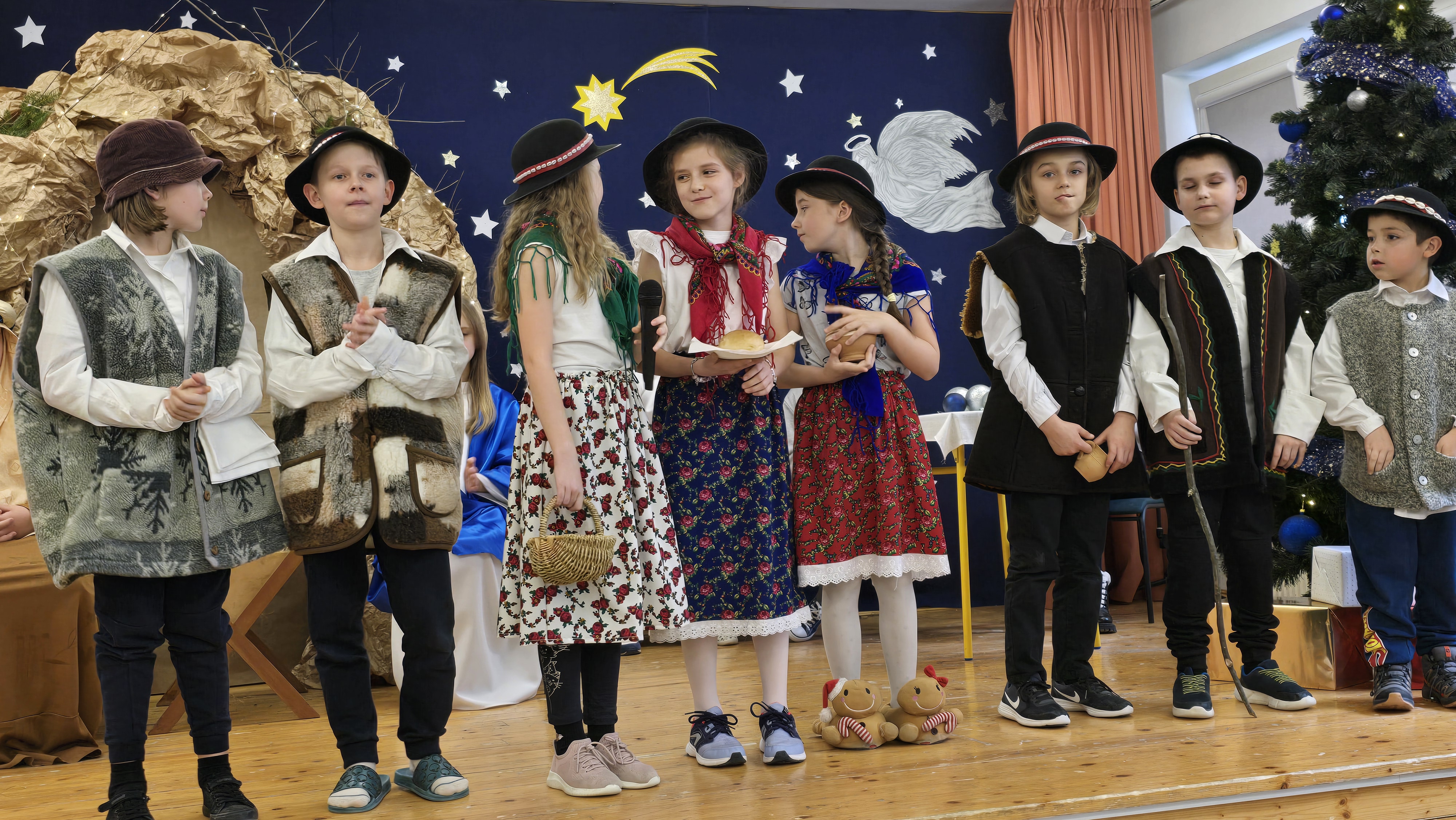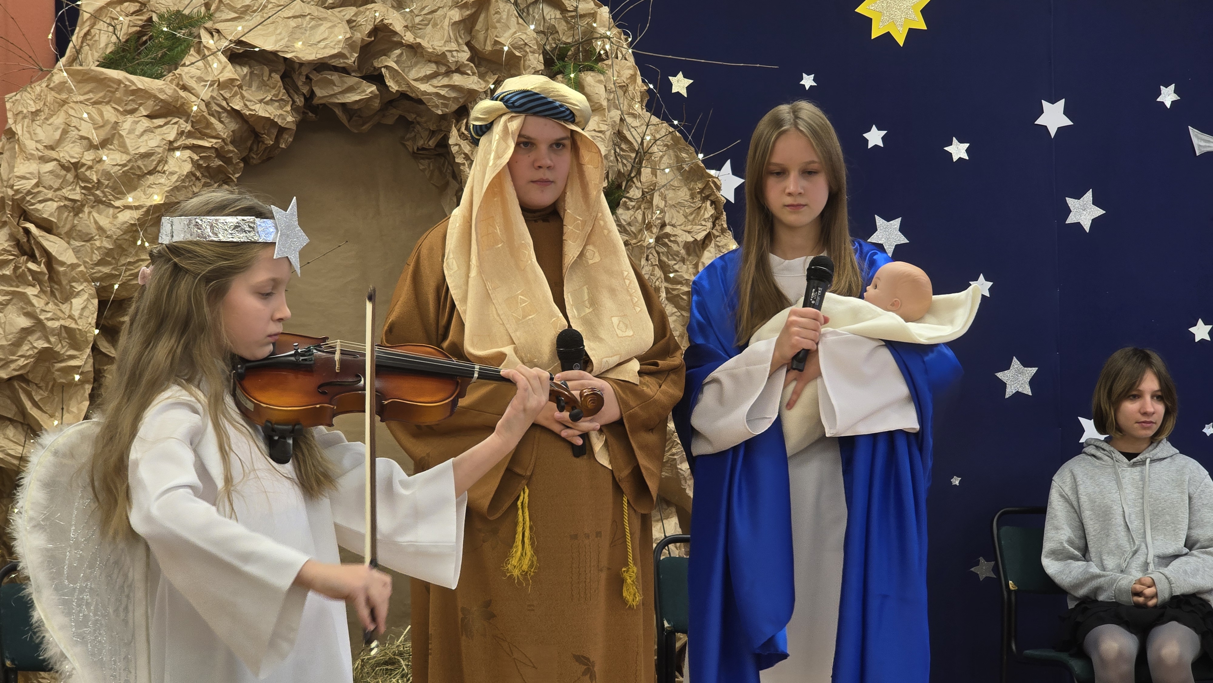 Jasełka były opowieścią snutą przez mamę do córki w czasie przygotowań do świąt, przywołując historię narodzin Jezusa w Betlejem, począwszy od drogi Maryi i Józefa do stajenki, aż po przybycie pasterzy i Trzech Króli. W spektaklu wzięły również udział postacie biblijne, takie jak anioły, pasterze i królowie. Uczniowie wystąpili w pięknych strojach, a przedstawienie wzbogacono o wzruszającą muzykę i świąteczne kolędy, które wprowadziły wszystkich w bożonarodzeniowy nastrój.