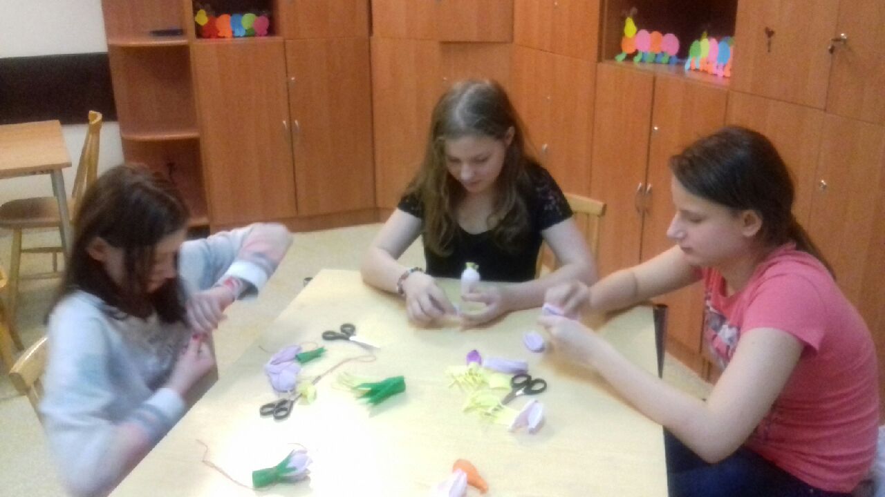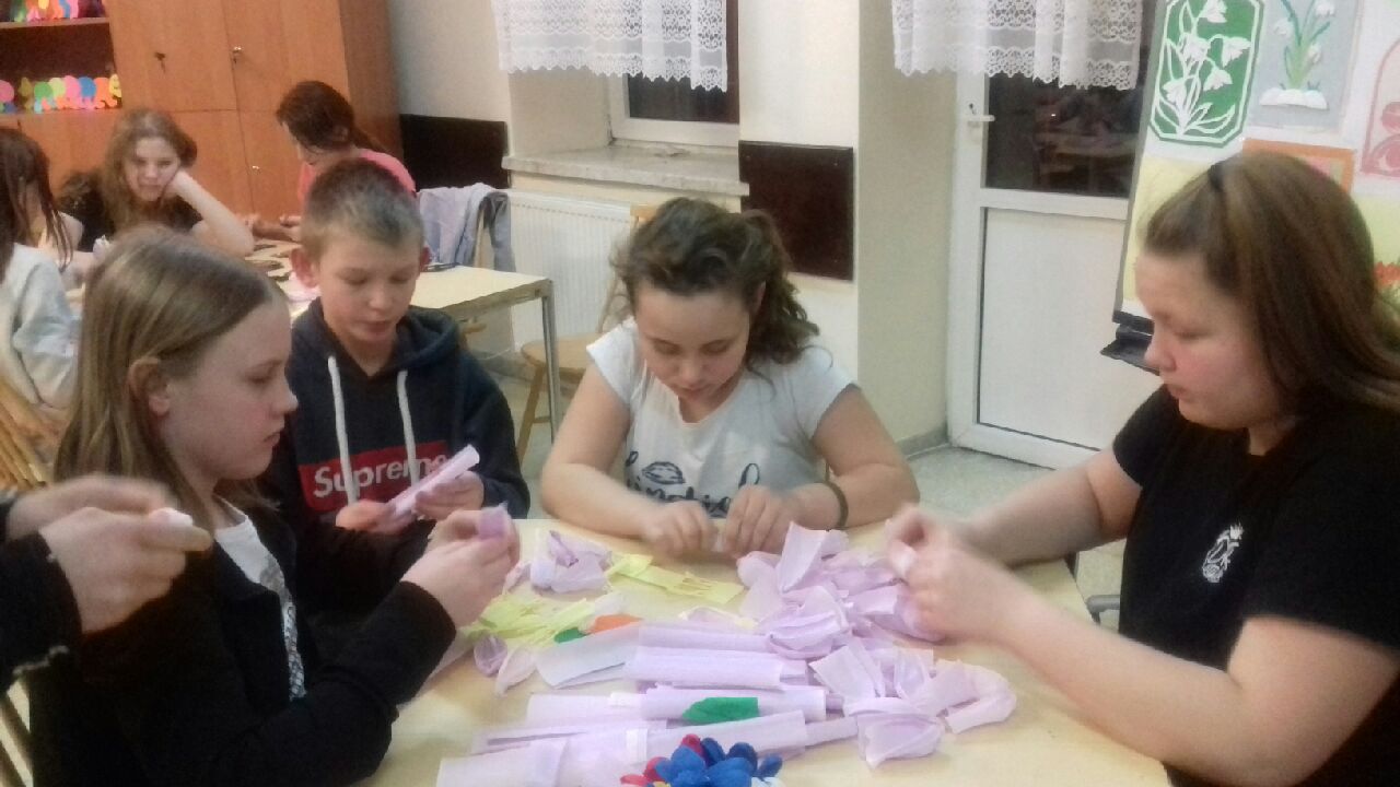 Nastał marzec a z nim z każdym dniem zbliżamy się do wiosny. W oczekiwaniu na nową porę roku - 25. 03.2019r na zajęciach pozalekcyjnych p. Krysia zapoznawała nas z nową techniką – bibułkarstwa , polegającą na robieniu kwiatów z kolorowej bibuły. Pod jej kierunkiem z wielkim zapałem wykonywaliśmy z kolorowej krepiny wiosennego krokusa, który rośnie na górskich halach. Jesteśmy wytrawnymi artystami – świetnie poradziliśmy sobie z wycinaniem, skręcaniem i składaniem kwiatka, a potem składaniem bukietów w całość. Bukiety kolorowych krokusów będą ozdabiać naszą palmę wielkanocną.:)