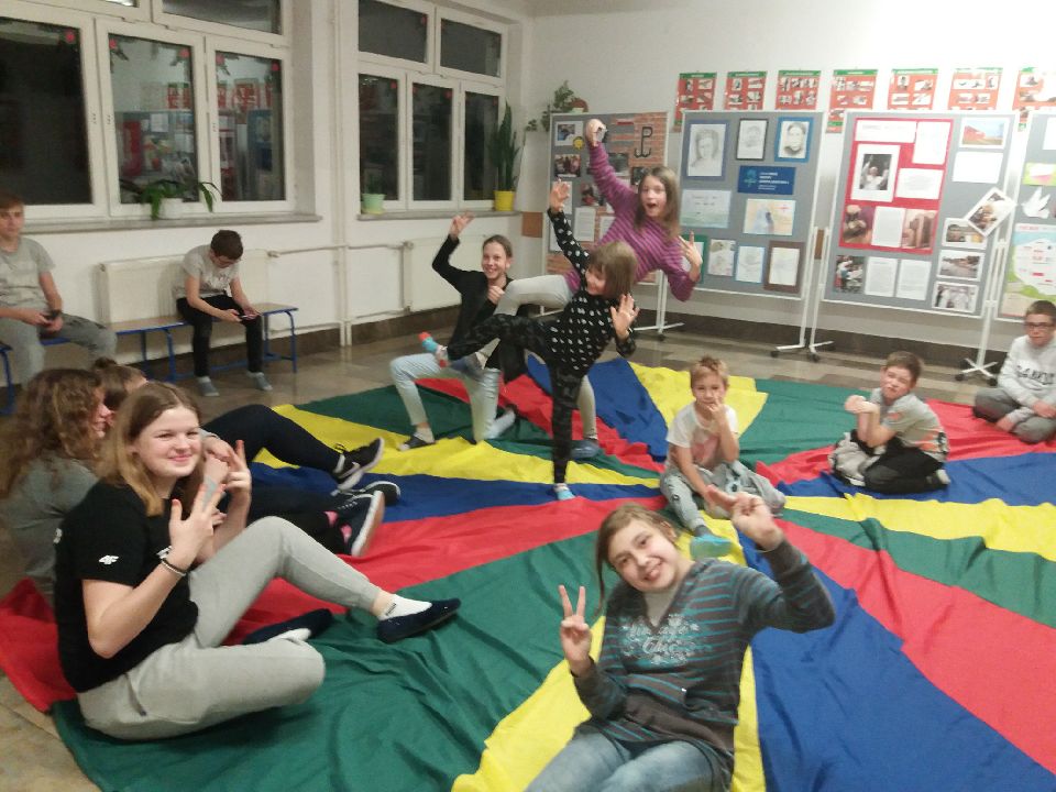 16.02. 2019r spędziliśmy wieczór na zabawach z wykorzystaniem kolorowej chusty. Były to bardzo wesołe zajęcia przeprowadzone przez p. Monikę i p. Beatę. Celem zabaw było kształtowanie poczucia wspólnoty grupowej oraz integracja dzieci starszych z młodszymi. Dzięki zabawom z chustą mogliśmy lepiej się poznawać ,a także przeżyć niezwykłą podróż w wyobraźni, gdy stawała się ona statkiem lub balonem. Zabawy wprowadziły radosny nastrój i odprężenie, dostarczyły wiele emocji zawłaszcza tych pozytywnych. Pomagały ćwiczyć refleks i spostrzegawczość, zwinność i zręczność zarówno dużych jak i małych uczestników zabawy.